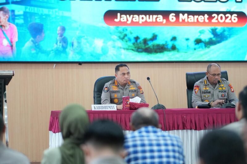 Kegiatan strategis ini dipimpin oleh Karoops Polda Papua, Kombes Pol Selamat Topan, S.I.K., M.Si., didampingi Kabid Humas Polda Papua selaku Kaops Rasaka Cartenz 2026, Kombes Pol Cahyo Sukarnito, S.I.K., M.K.P., serta dihadiri oleh jajaran pejabat utama dan Kasatgas terkait.